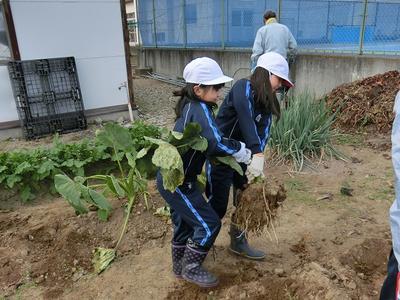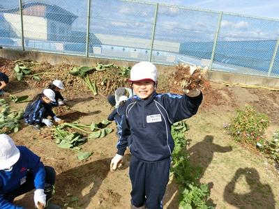 10月21日(水)午後,4年生がサトイモを収穫しました。大きく育った茎を思いっきり引っ張たら,根っこに里芋がたくさん!!大豊作!子どもたちの笑顔があふれました。たくさん実っただけに,親芋から小芋を離したり,根っこを取り除くのが一苦労。でも,それも豊作の喜びですね。