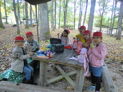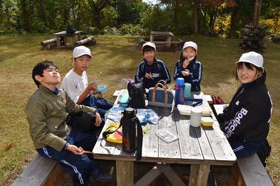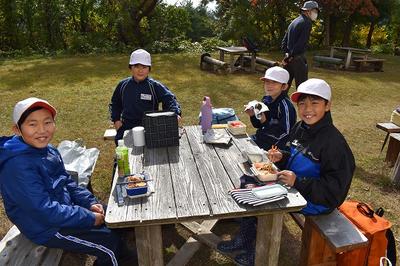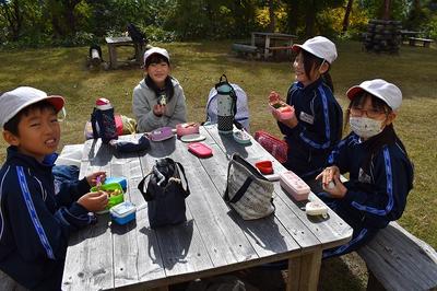 散策の後はお待ちかねの弁当と焼き芋!おいしそうに食べていました。食べた後はキャンプ場を歩きながら生活科授業で使う落ち葉を集めました。途中雨が降ってきたときもありましたが,とても楽しい1日でした。