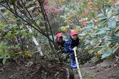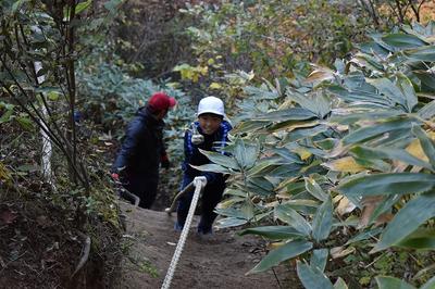 クヌギ林に行って,まずは先日収穫したサツマイモで焼き芋をつくるために,落ち葉を集めました。集めた後はイモを焼いてもらうことを所員の方にお願いして,自然散策コースへ出かけました。途中やぐらに上ったり,ロープを使って斜面を下ったりして楽しくめぐりました。