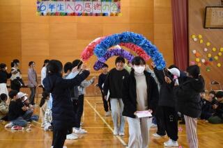 2月25日(水)に、「6年生を送る会」が行われました。7人の5年生が中心となって準備を進め、会場の飾りつけなどを4年生が担当してくれました。クイズや鬼ごっこで全校児童が交流したり、スライドショーで6年生の活躍を振り返ったりして、楽しく過ごしました。最後に、縦割り班ごとに丸くなって、1~5年生からのプレゼント、そして6年生から下級生へメッセージカードが渡され、温かい雰囲気になりました。少ない人数で、一人何役も担当してがんばってくれた5年生、すばらしい活躍でした。