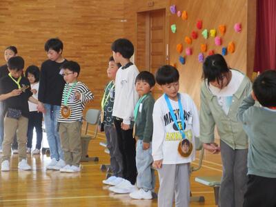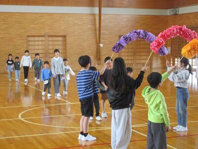 4月24日は1年生を迎える会でした。6年生を中心に高学年が企画し進めてくれました。1年生が花のアーチをくぐって入場した後は,全校鬼ごっこで大いに楽しみました。そして,1年生一人一人に顔写真を使った大きなメダルをプレゼント。体育館いっぱいに笑顔があふれた1年生を迎える会でした。